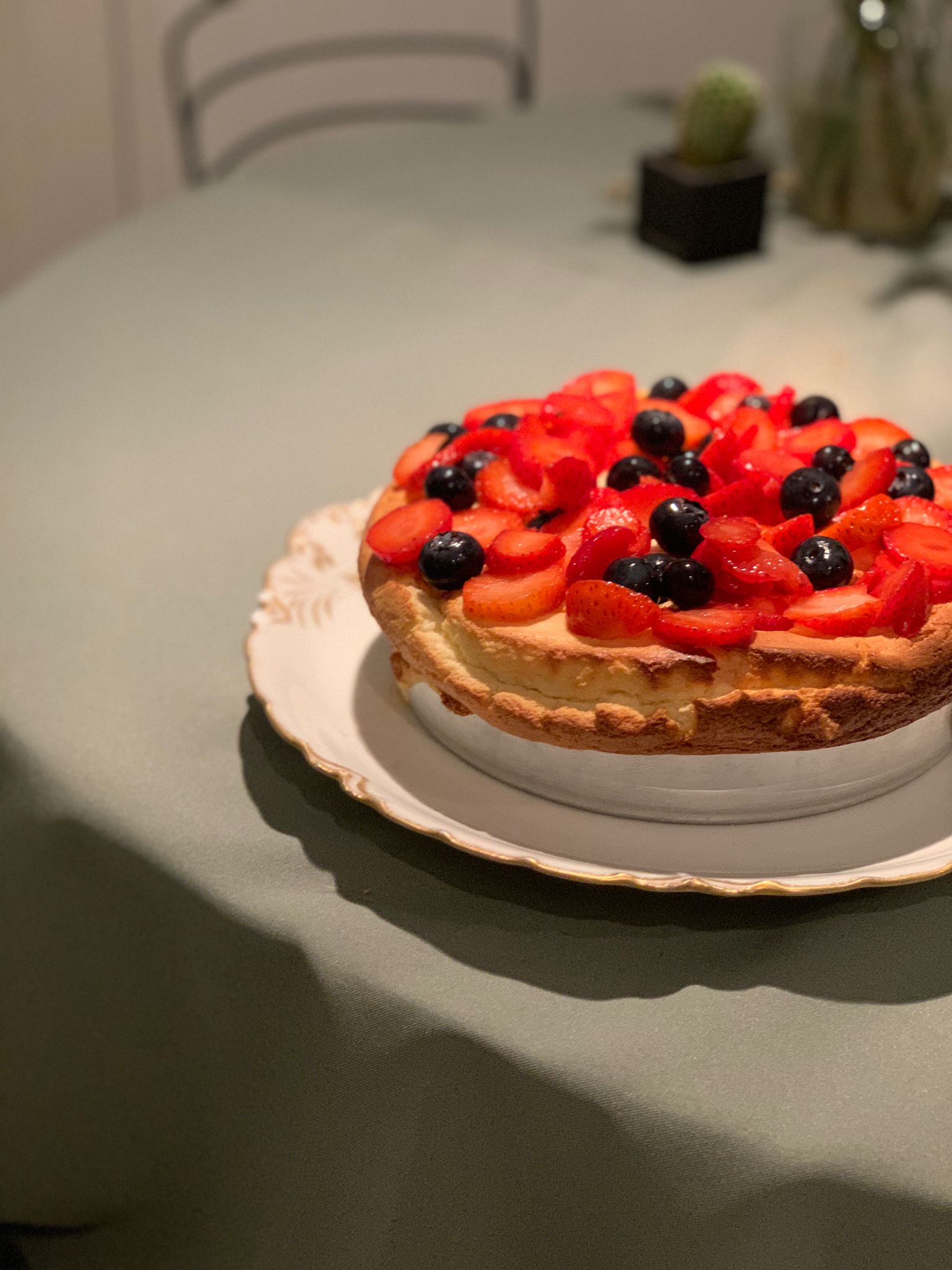 When I came back from the Jubilee party it was time to pour the filling (which I’d left in the fridge) onto the cratered base. The cake then goes in for 1.5 hours and you finish by letting it cool slowly with the oven door open. Unfortunately I hadn’t left enough time for the cake to cool properly before the birthday celebrations so it came to the table warm. It also arrived decorated with strawberries and blueberries. Again, Claudia didn’t tell me to do this but it was a side-effect of using too small a cake tin so the whole thing souffled over the rim and cracked. From craters to ice flows I was going full geography.