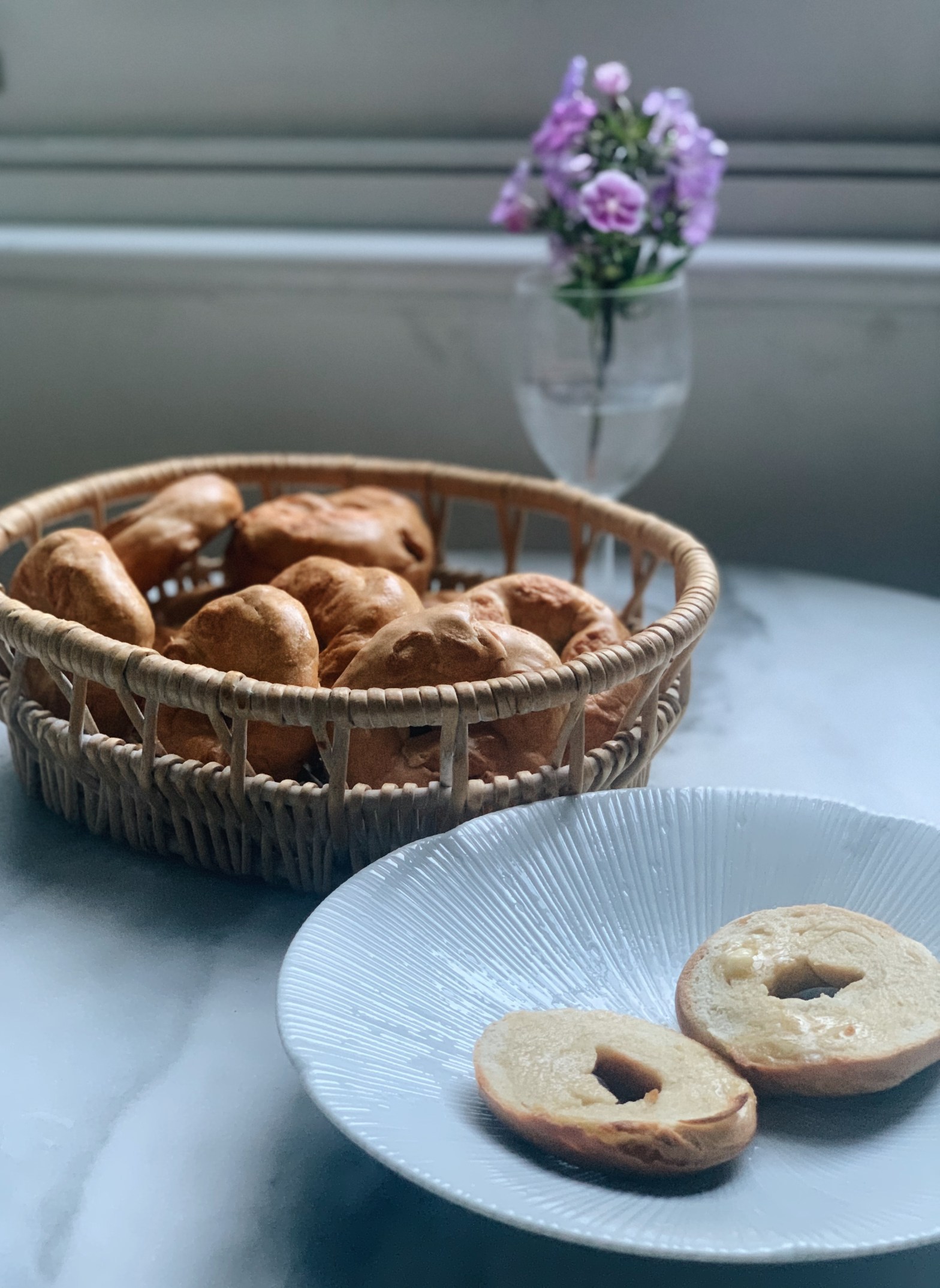 Claudia’s research suggests the addition of an egg to the standard flour, yeast, oil recipe. I made a vegan (standard) and non-vegan egg version to satisfy the hungry household. I haven’t quite pinpointed what went wrong. I suspect it’s a combination of not kneading enough, never being very good at judging the difference between 5 and 7 inches (before you squeeze the ends of the bagel ‘rope’ together into its bracelet shape Claudia says the rope should be 7 inches long), and not leaving them for long enough once shaped to double in size. Or it could be any manner of other incompetence along the way.